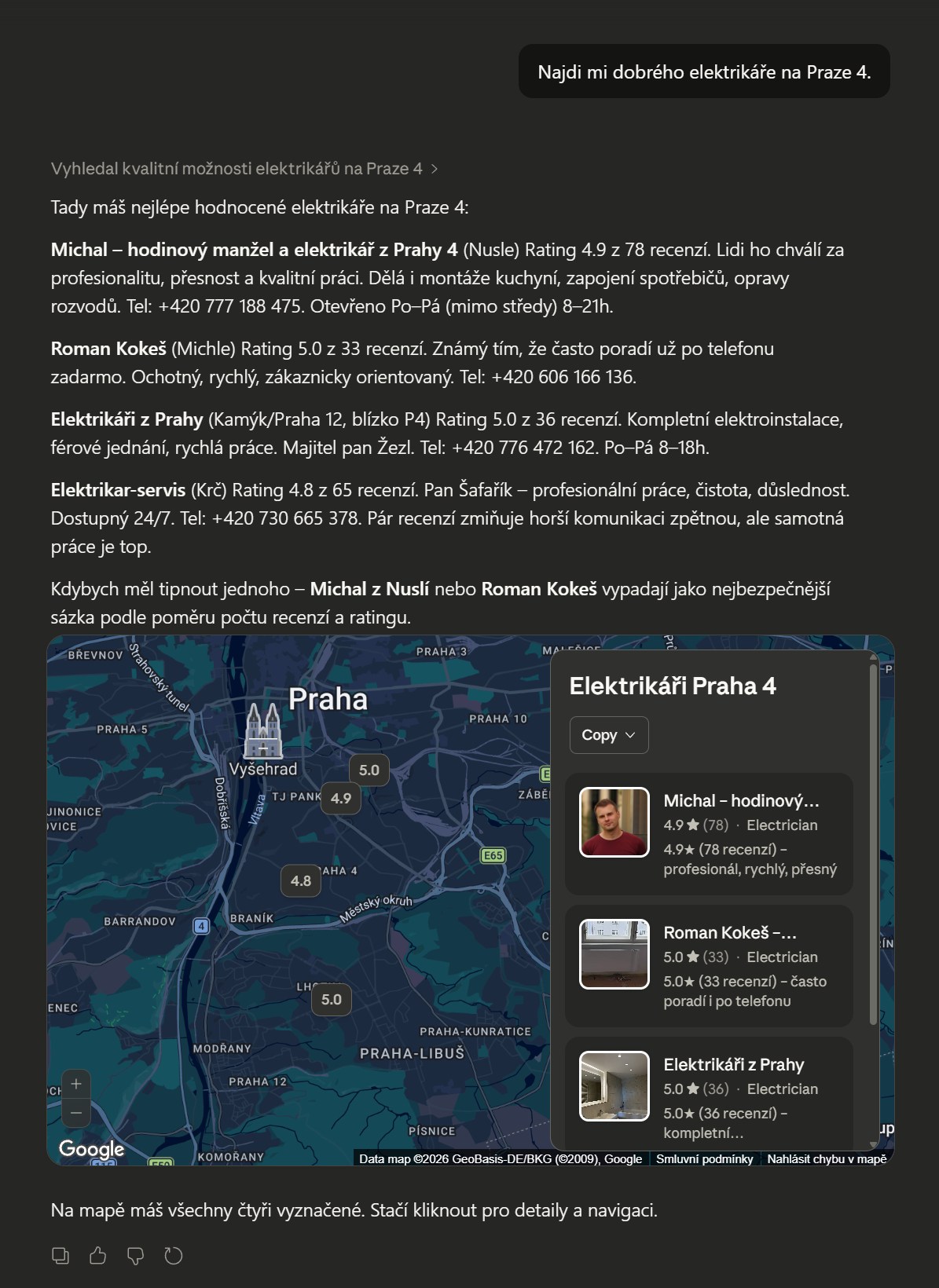 Lidé už nehledají jen v seznamu. Ptají se umělé inteligence: "Najdi mi dobrého elektrikáře na Praze 4" AI v tu chvíli projde stovky Google recenzí a doporučí toho, kdo jich má nejvíc a nejlepší. Pokud nemáte recenze, pro umělou inteligenci neexistujete – doporučí vaši konkurenci. Chvalomat zajistí, že vy budete tou první volbou.